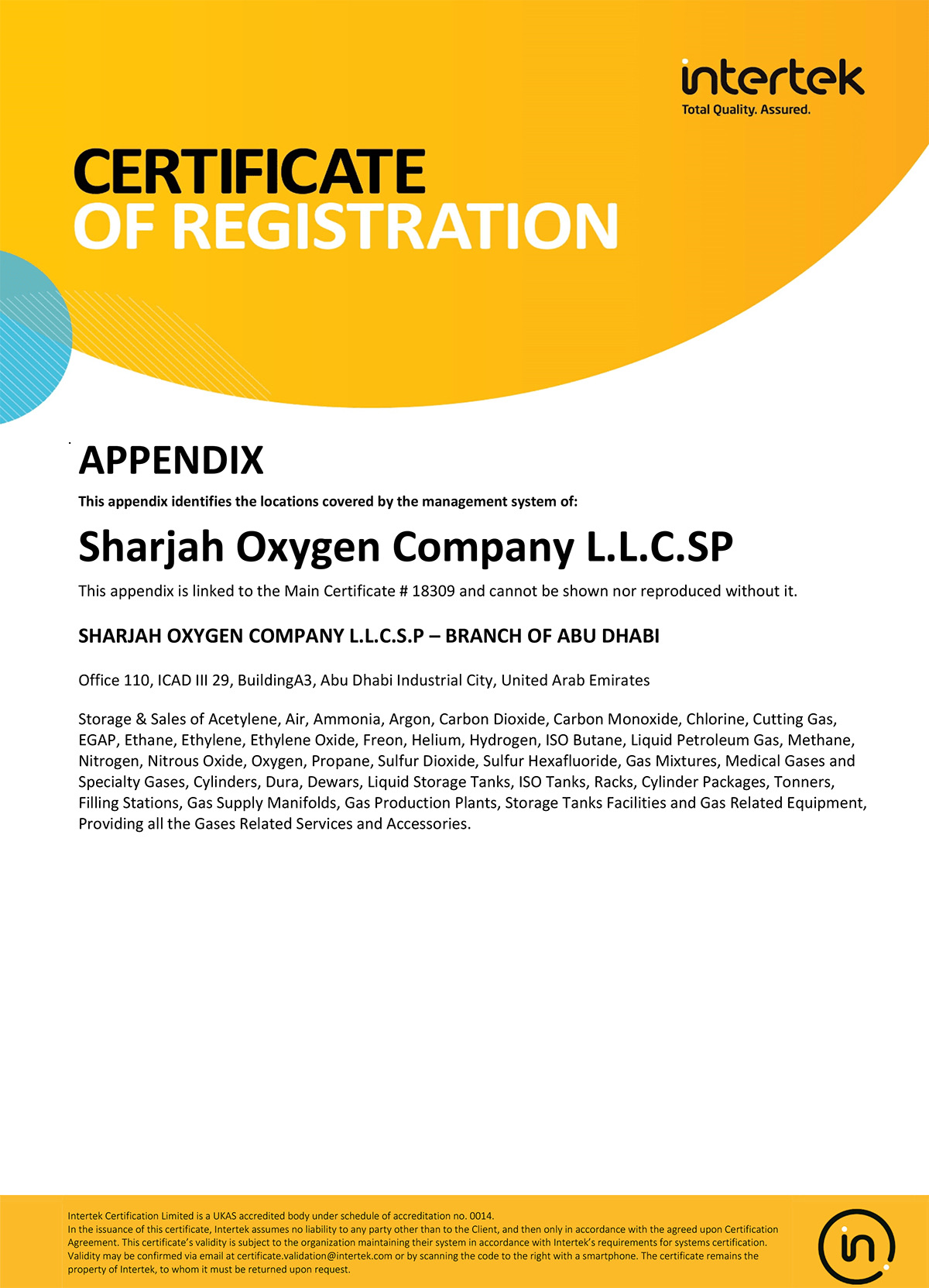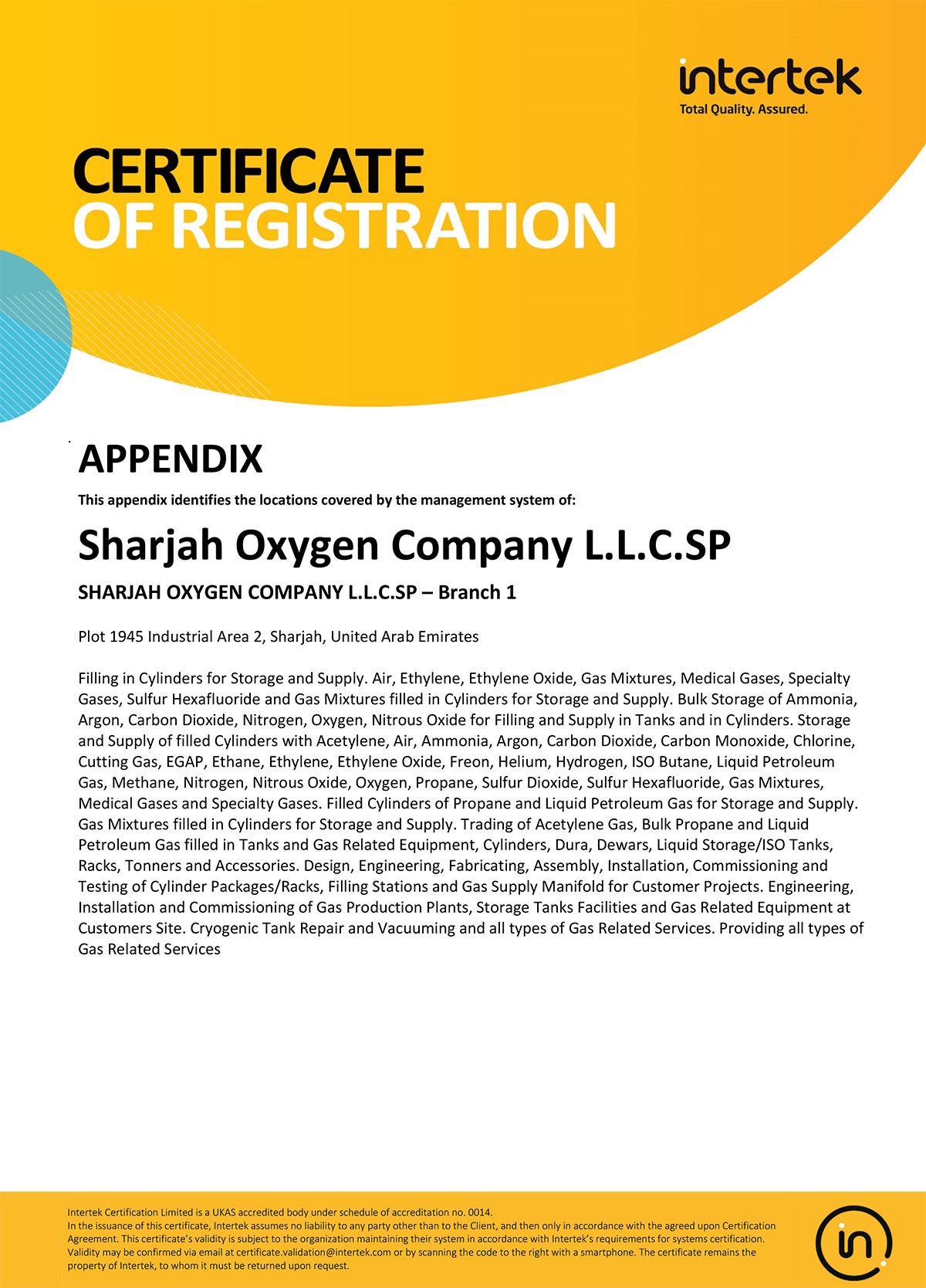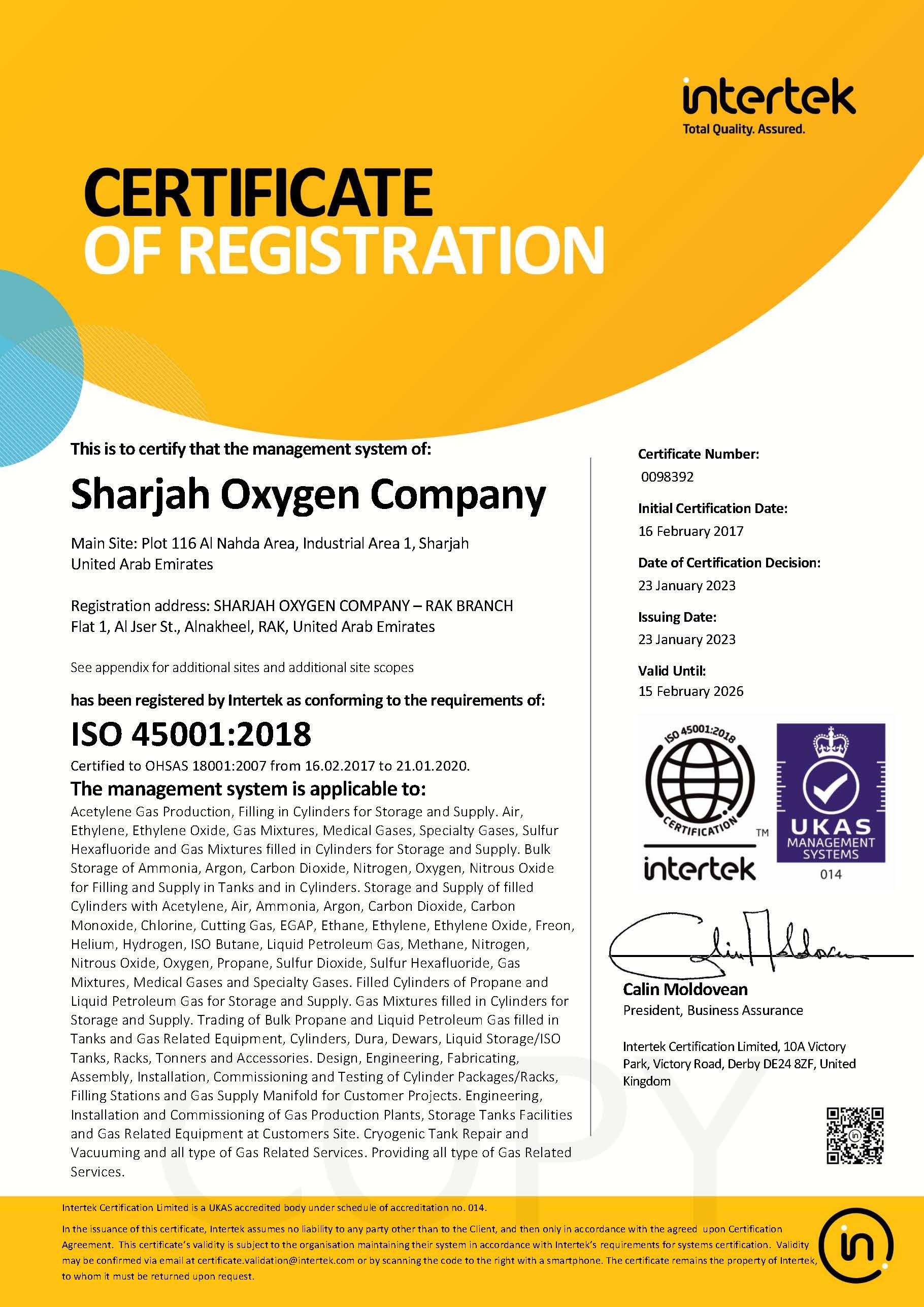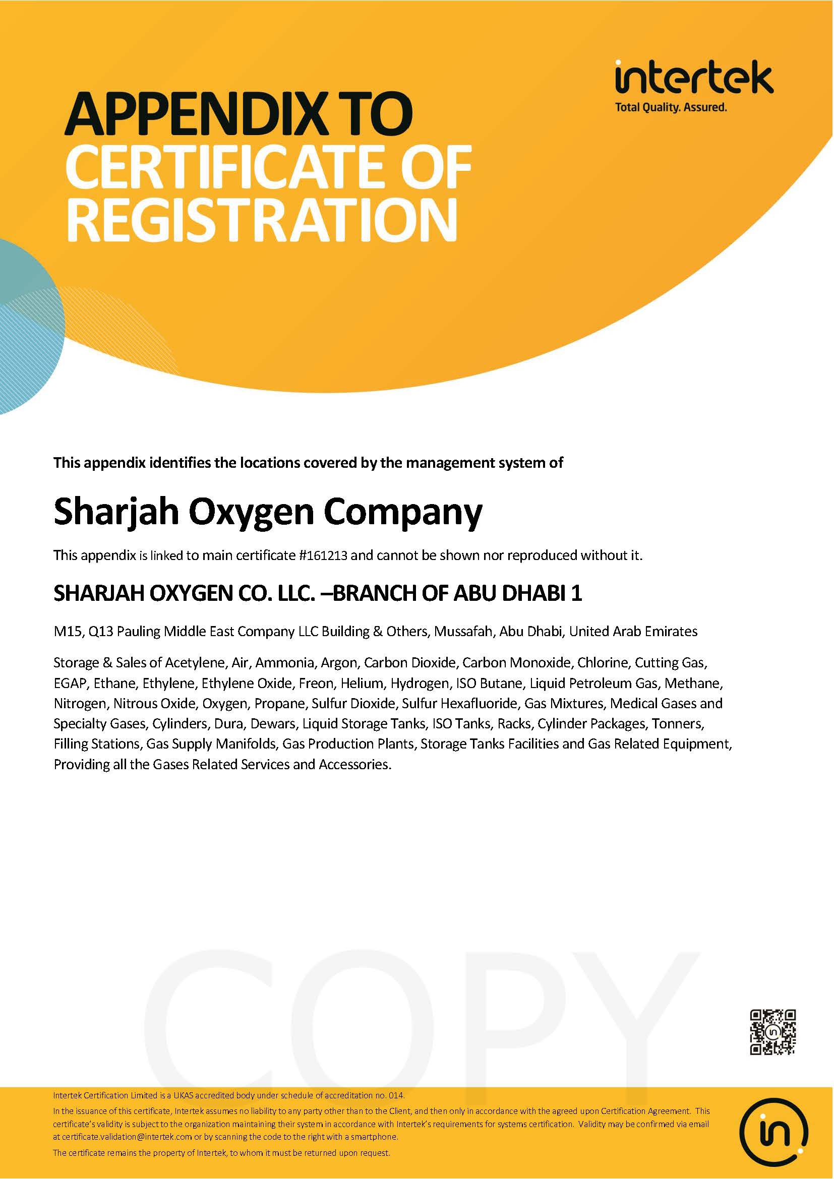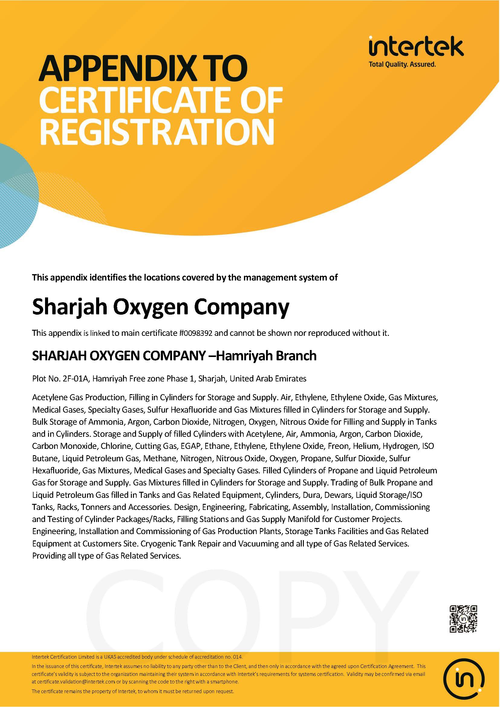 SHARJAH OXYGEN COMPANY L.L.C.SP has been granted the ISO 9001:2000 registration certificate in July 2004 on account of its commitment to achieve and perfect the product quality and services through the implementation and adherence to the laid down QUALITY MANAGEMENT SYSTEMS procedures, work instructions and organizational objectives and was upgraded to ISO 9001:2008 on 28 May 2014.