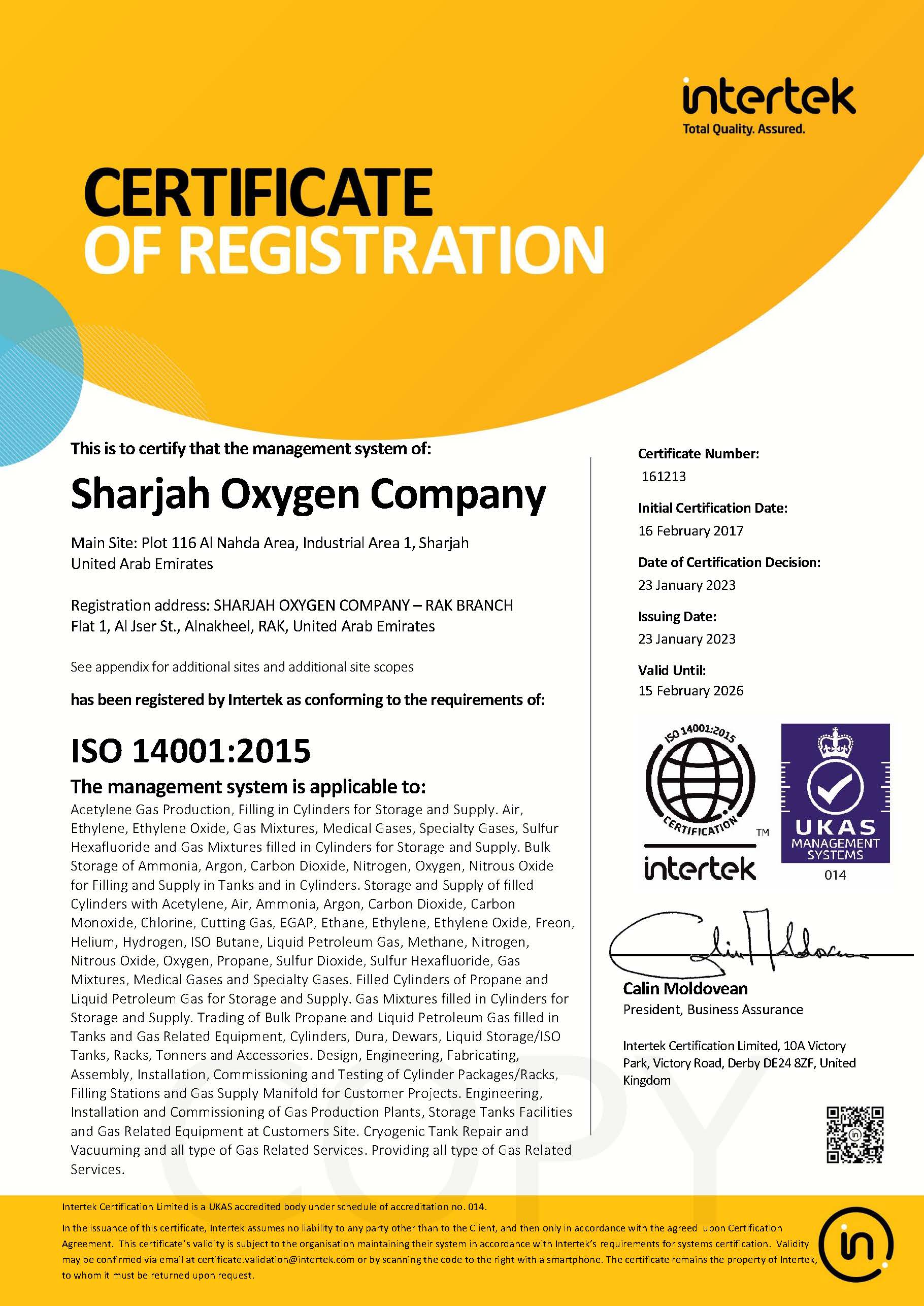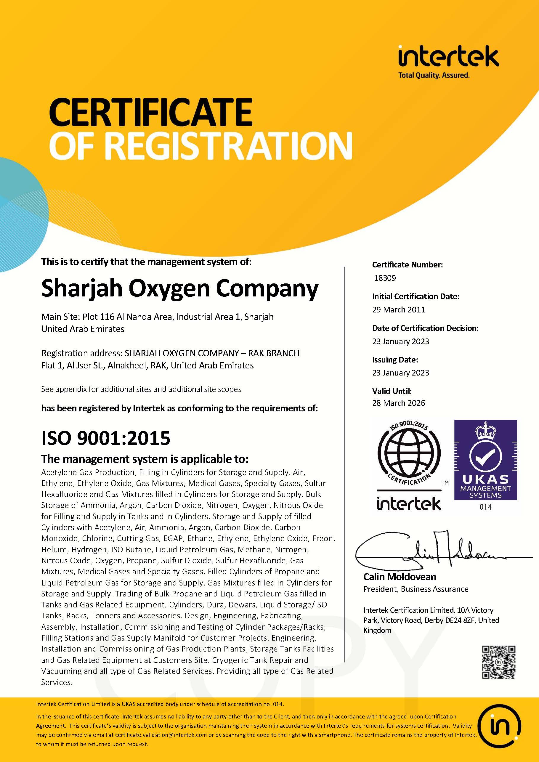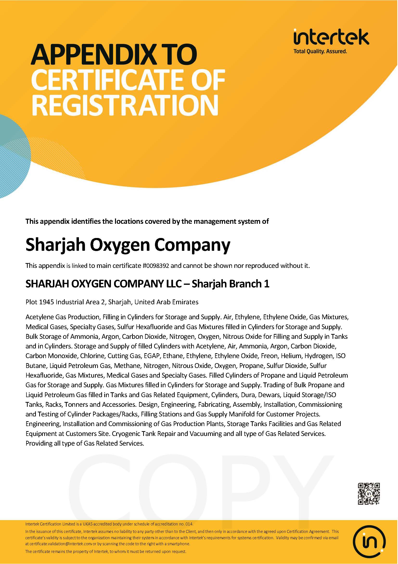 SHARJAH OXYGEN COMPANY L.L.C.SP has been granted the ISO 9001:2000 registration certificate in July 2004 on account of its commitment to achieve and perfect the product quality and services through the implementation and adherence to the laid down QUALITY MANAGEMENT SYSTEMS procedures, work instructions and organizational objectives and was upgraded to ISO 9001:2008 on 28 May 2014.