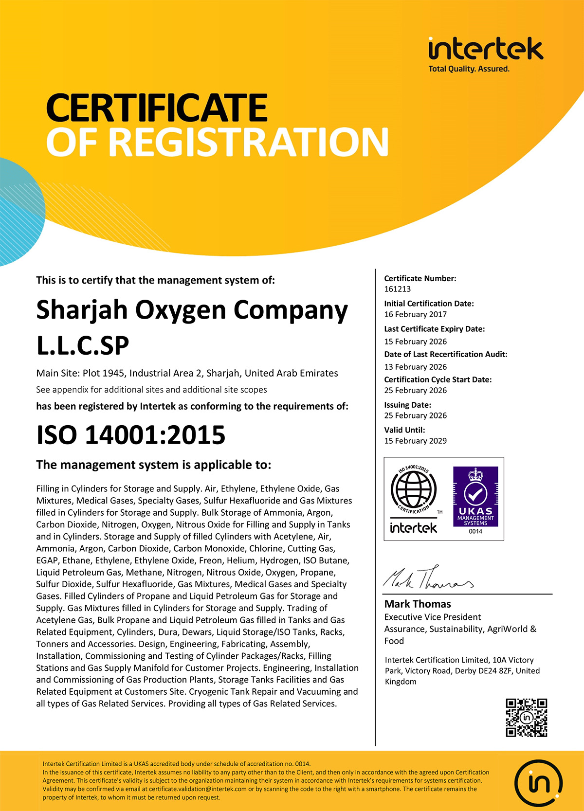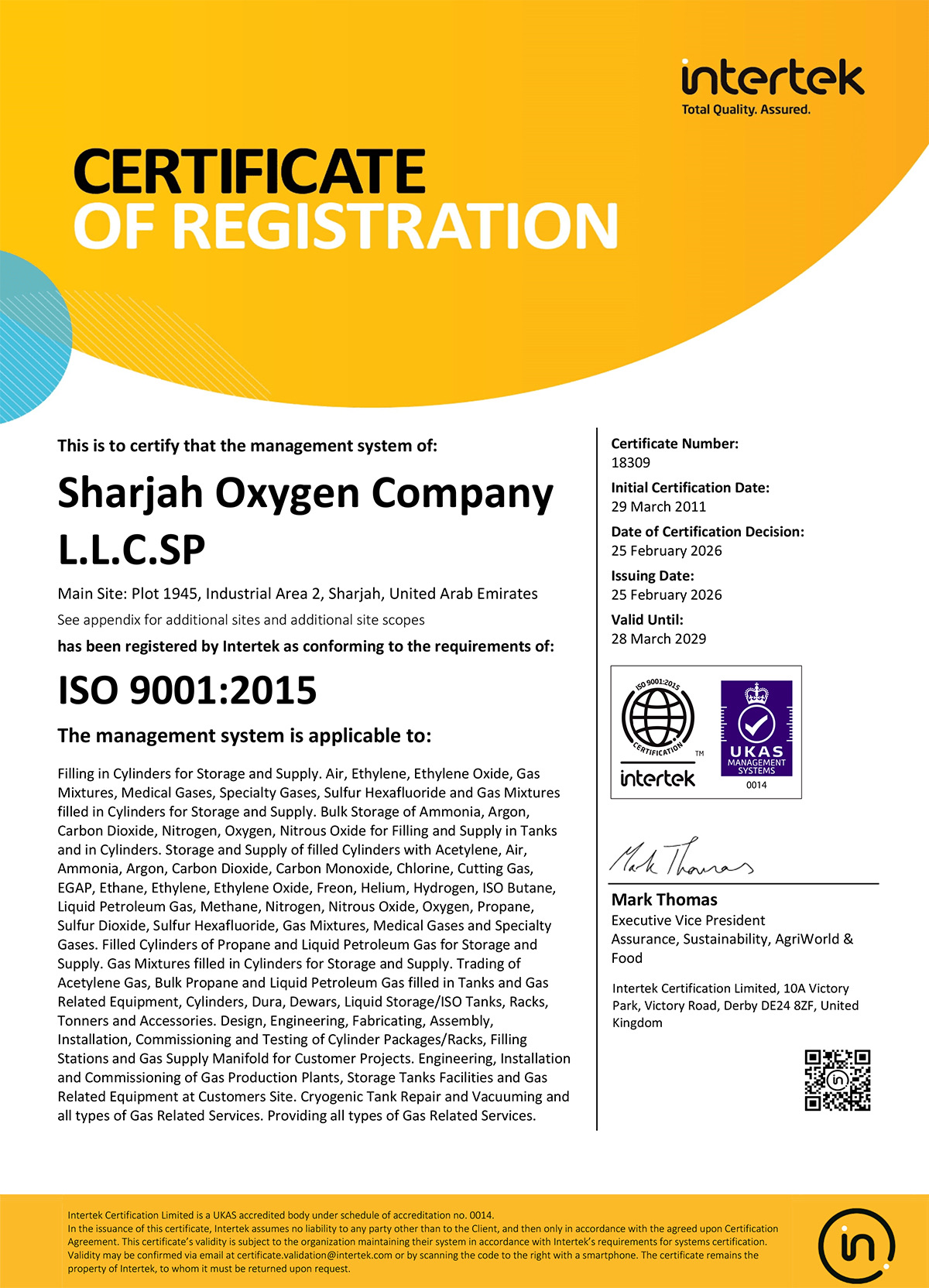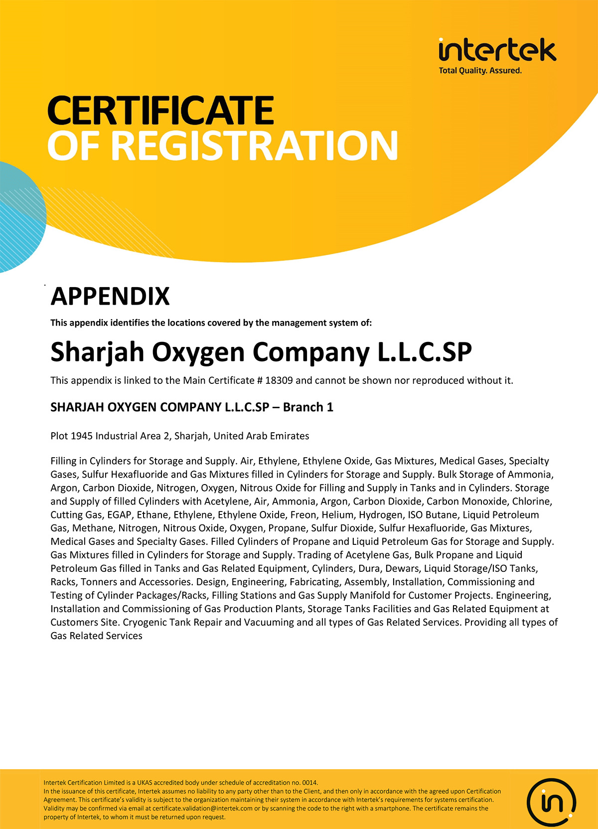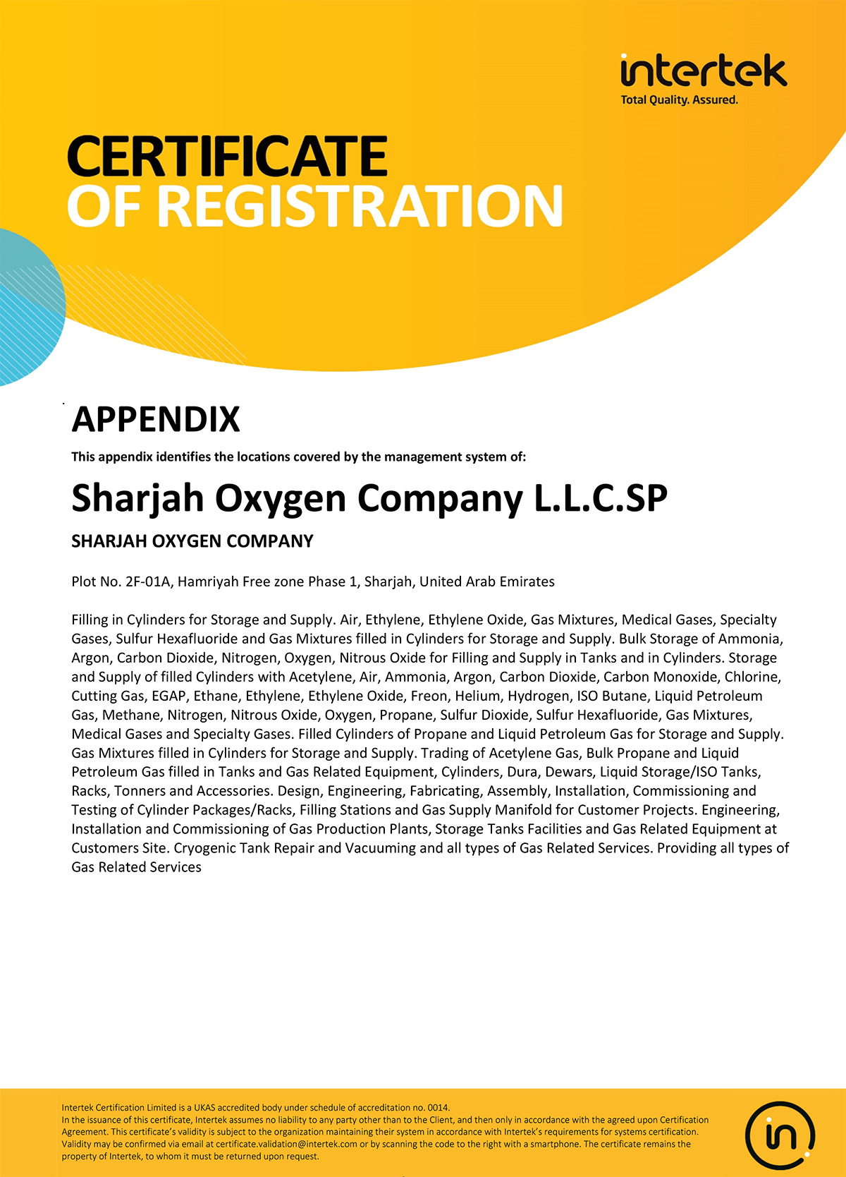 SHARJAH OXYGEN COMPANY L.L.C.SP has been granted the ISO 9001:2000 registration certificate in July 2004 on account of its commitment to achieve and perfect the product quality and services through the implementation and adherence to the laid down QUALITY MANAGEMENT SYSTEMS procedures, work instructions and organizational objectives and was upgraded to ISO 9001:2008 on 28 May 2014.